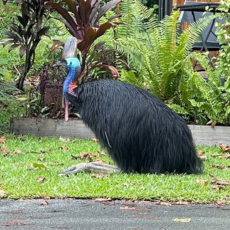 Een stukje verderop komt er een Cassowary aan lopen. Interessante vogel. Op zijn enorme poten, schrijdt hij gracieus over het strand, voortdurend om zich heen speurend of er iets eetbaars te vinden is. Ogenschijnlijk lijkt hij zich niets van de mens aan te trekken. De volgende ochtend scharrelt hij rond op de camping en gaat er op zijn gemak bij zitten. Dat ziet komisch uit.