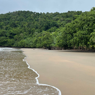 Etty Bay is een kleine baai waar het dichte regenwoud tot aan de rand van het strand groeit. Het zeewater is warm en troebel. Door de vele regen en wind en geen zon ziet het er heel anders uit dan de foto's op Instagram en Google.